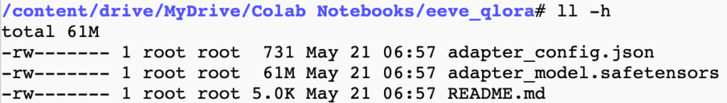 저장된 모델 가중치 파일의 크기를 확인해 보시면, MB 단위로 매우 작습니다. 이는 모델의 전체 가중치가 아닌, QLoRA가 적용된 가중치만 저장된 것이기 때문입니다.
