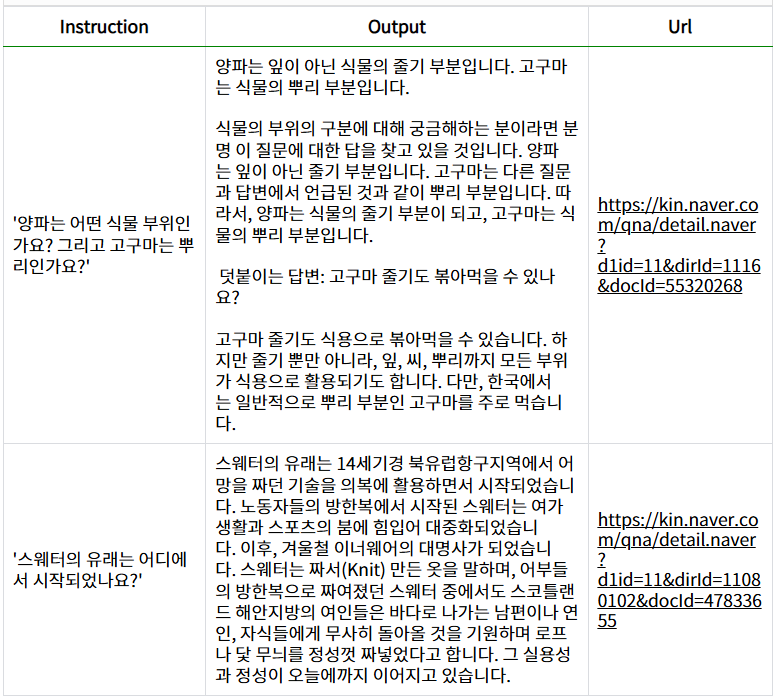 Instruction은 질문(지시사항), output은 질문에 대한 답변, url은 데이터의 출처를 나타내고 있습니다.