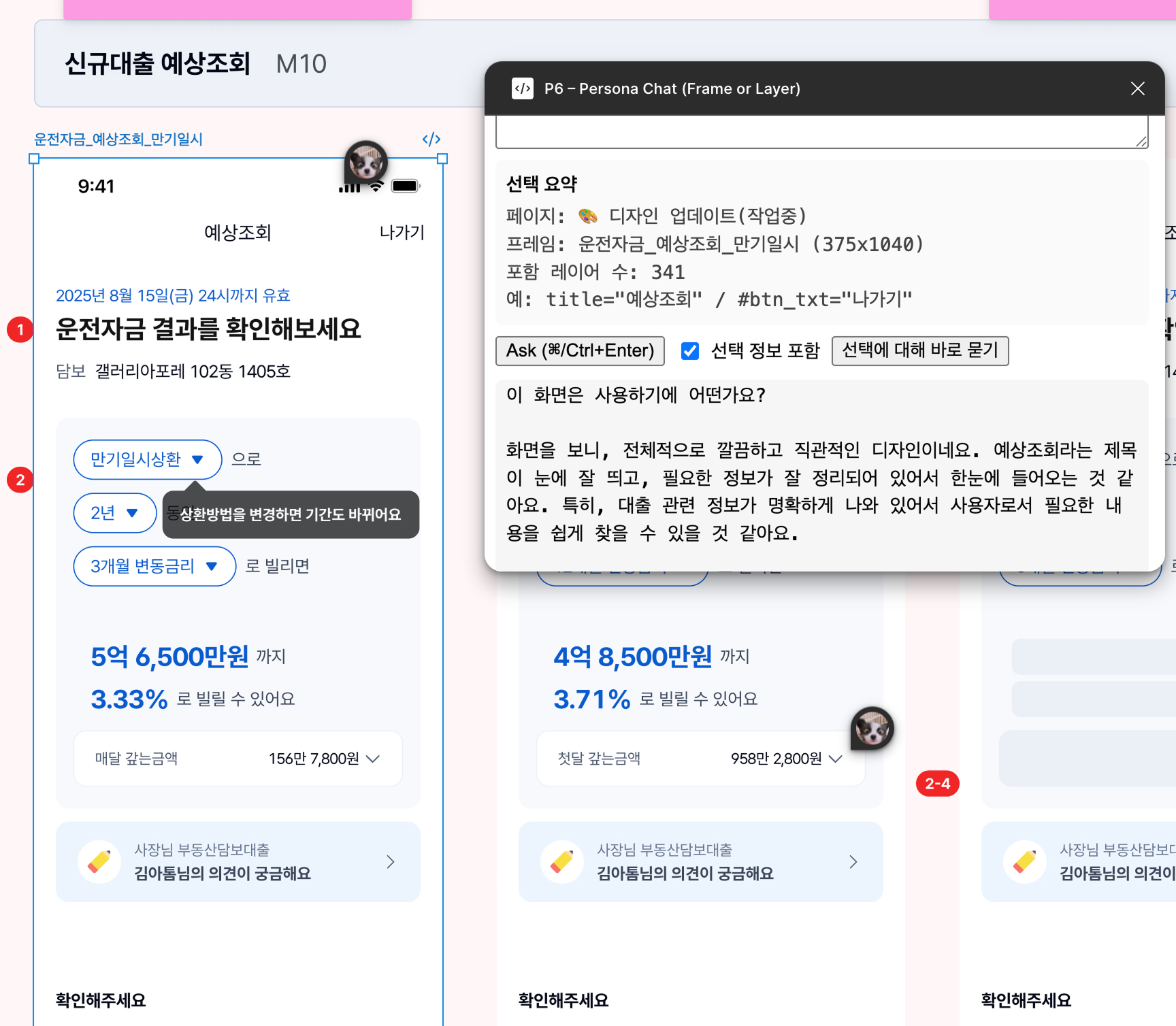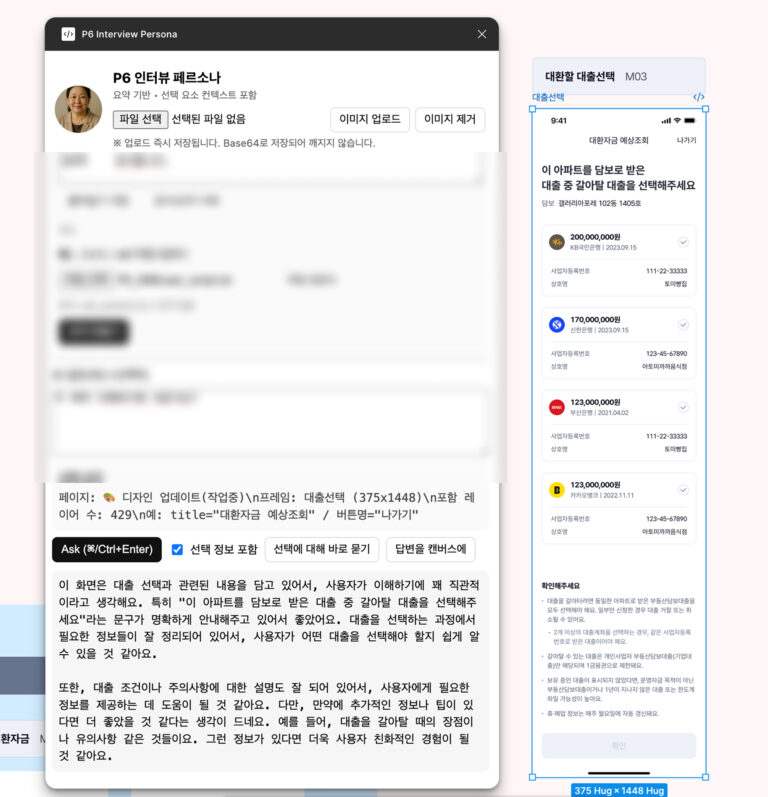 인터뷰 후 저는 결과를 단순 정리용으로만 남겨두고 싶지 않았습니다. 그래서 프로덕트 디자인 과정에 사용자들의 이야기와 맥락을 밀접하게 적용하고 참고할 수 있도록 하나의 자료로 만들었어요. 비식별화한 인터뷰 자료에 제한적인 AI 활용 방식을 덧붙였고, 이를 피그마 플러그인 형태로 연결해서 작업 시 참고했습니다. 이 방식은 저에게 충분한 의미가 있었어요.