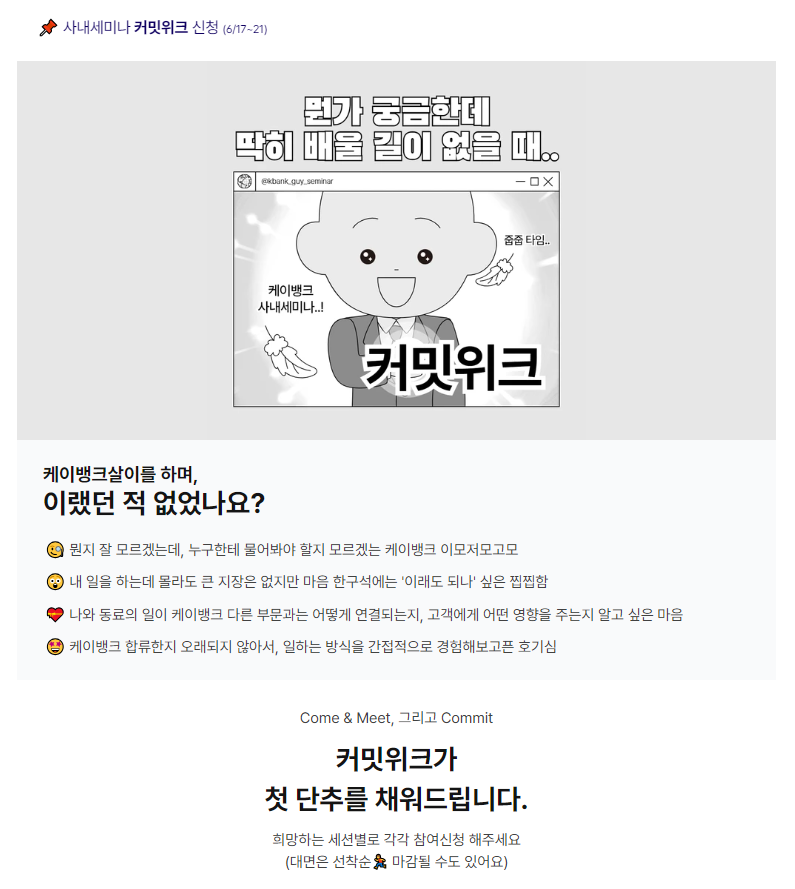 케이뱅크에서는 반기마다 ‘커밋위크‘라는 사내세미나를 진행해요! ✨