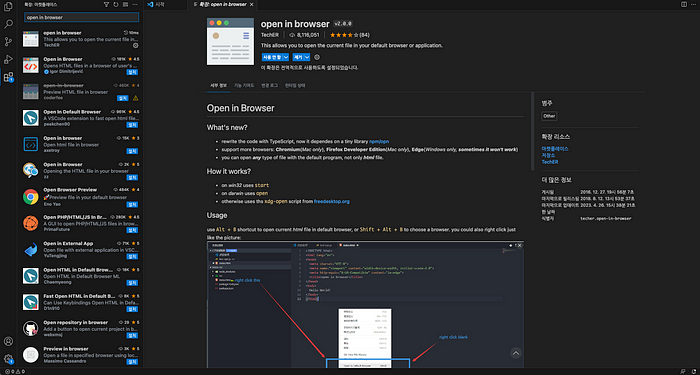VSCode 메인화면에서 좌측 맨 아래에 있는 아이콘을 클릭하면 아래와 같이 플러그인을 검색할 수 있는 화면이 출력됩니다. ‘open in browser’를 검색하여 플러그인을 설치할 수 있습니다.