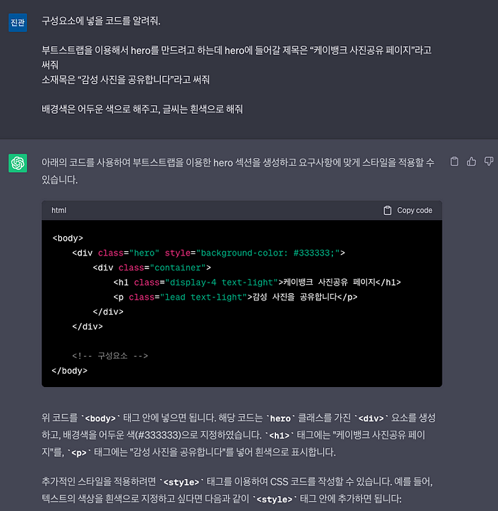 먼저 hero 아래에 공백을 넣기위해 아래와 같이 ChatGPT에게 질의 합니다.