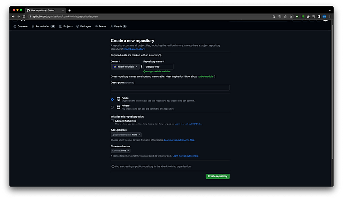 - github 접속 후 ‘Repository’ -> ‘New repository’를 선택하면 아래와 같은 화면이 출력됩니다. 저는 repository name을 ‘chatgpt-web’으로 작성 한 후 아래의 ‘create repository’ 버튼을 눌러 repository를 생성해보도록 하겠습니다
