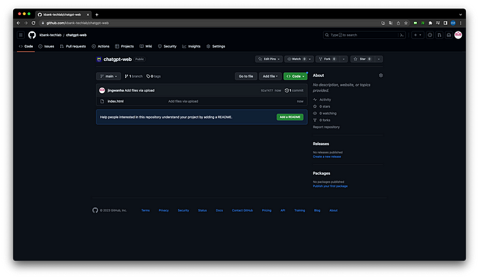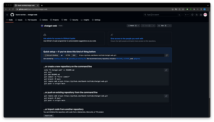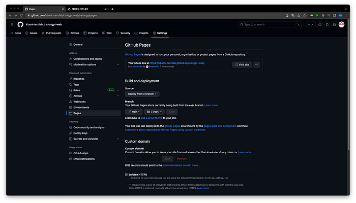6. 생성된 url (https://kbank-techlab.github.io/chatgpt-web/)을 통해 접속하게 되면 아래와 같이 웹 페이지가 정상적으로 접속되는 것을 알 수 있습니다.