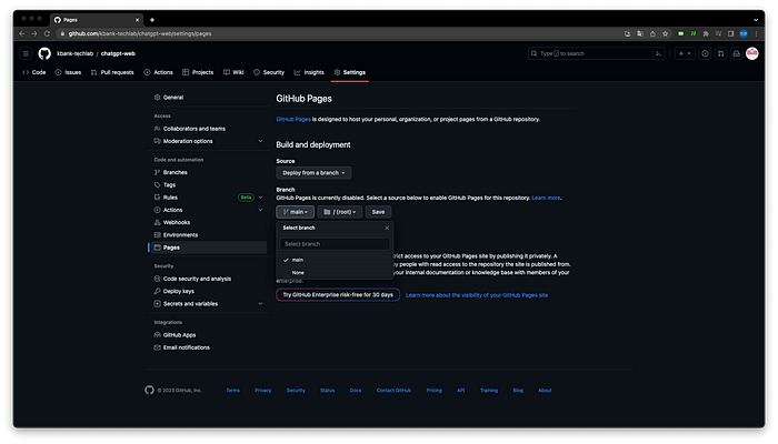 4. Settings → Pages → Branch 를 ’None’ 에서 ‘main’으로 변경 후 Save 버튼을 눌러 저장해줍니다.