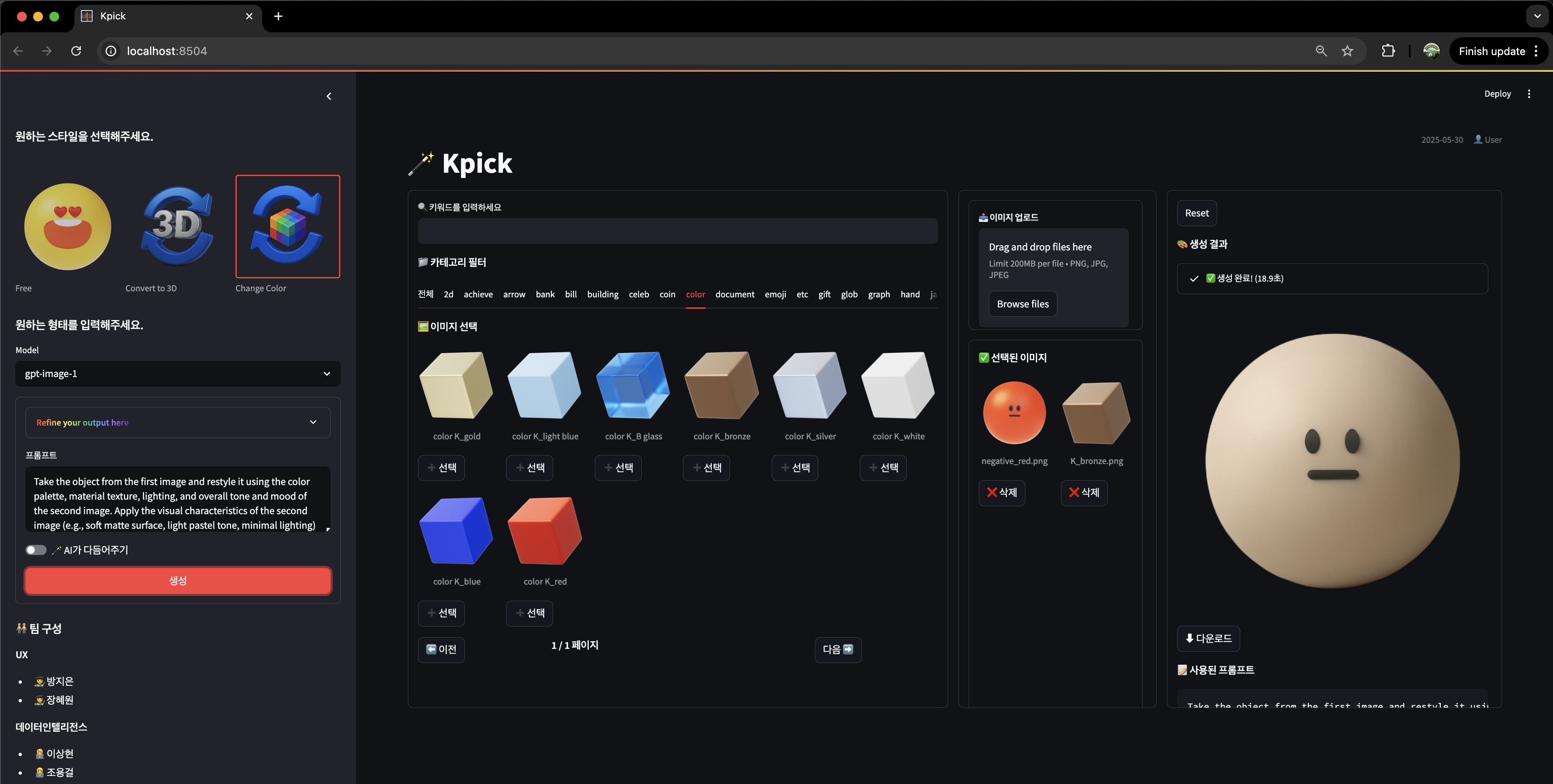 케이뱅크에는 대표 컬러로서 사용되는 3D Graphic primary material들이 있습니다. 아래 사진 예시와 같이 큐브형태의 여러 이미지들이 존재하는데요. 왼쪽 사이드바 상단에 Change Color 아이콘을 선택해서 사전에 정의된 프롬프트 프리셋을 사용하고 변경을 원하고자 하는 이미지와 함께 선택해서 새로운 이미지를 생성하게 됩니다.