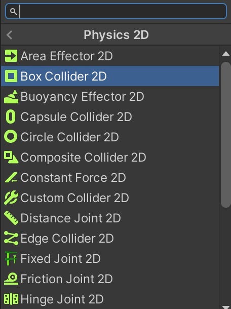 똑같이 Add Component 를 클릭하고 Box Collider 2D를 생성해주자