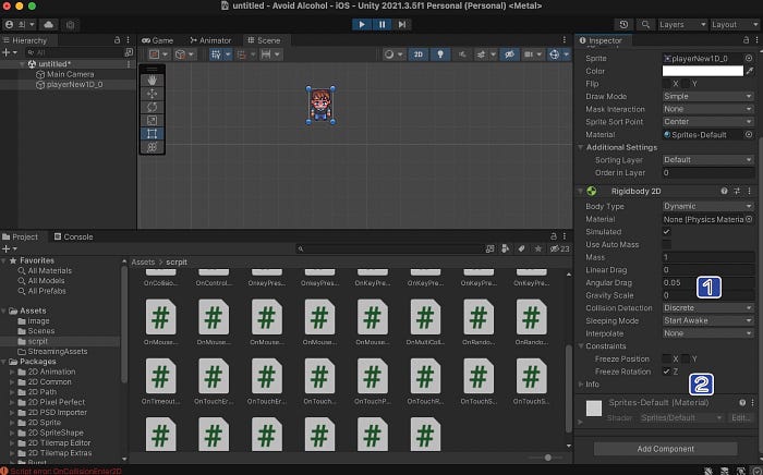 똑같이 Add Component 추가해서 Rigidbody 2D 추가해주고 값세팅도 똑같이 해주고