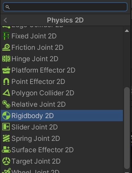 똑같이 Add Component 추가해서 Rigidbody 2D 추가해주고 스크립트 똑같이 적용해주면 됨