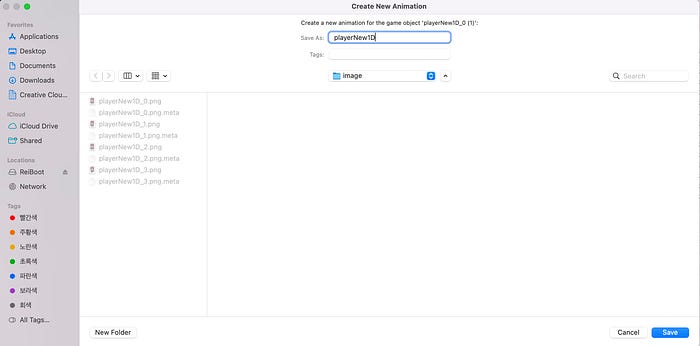 아래처럼 나오는 화면에서 애니메이션의 이름을 정의해주고 저장