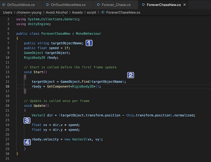 3️⃣ 술래 개체의 위치와 주인공 개체의 위치의 차를 구해서 해당 Vector의 값을 정규화해서 쫓아갈 방향과 속도를 계산
