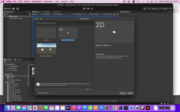간단한 게임을 만들기 위해서 scene을 생성하자.