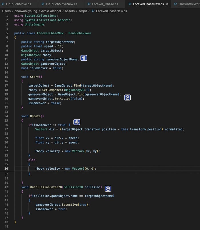 3️⃣ 술래 개체가 특정 오브젝트와 충돌이 있을 때에 OnCollisionEnter2D 이벤트가 생긴다. 해당 코드의 내용은 충돌한 개체의 명이 주인공 개체면 gameover 이미지를 띄워주고 gameover flag를 true로 해준다.