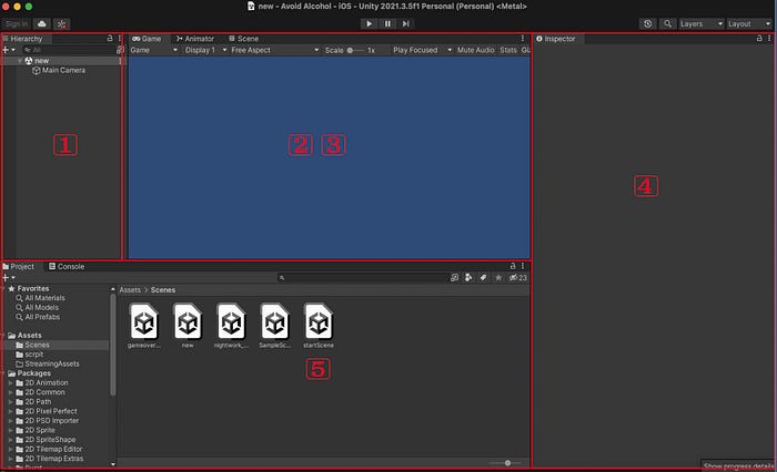 5️⃣ 프로젝트 창 : 게임에 필요한 요소를 파일형태로 관리하고 있는 프로젝트 뷰. 이미지(Asset), 스크립트, 에니메이션, Scene등 모든 것이 있음