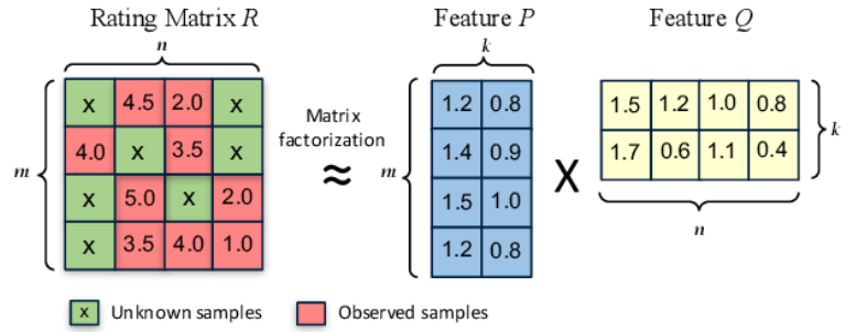 'Netflix Prize'를 통하여 유명해진 Matrix Factorization은 latent space를 공유하는 User vector와 Item vector의 내적을 통해 Interation을 모델링하는 방법입니다. 아래 그림에서와 같이 Feature P(User latent matrix), Feature Q(Item latent matrix) 행렬분해하여 unknown sample을 추정하는 방식입니다. 추정시 내적의 값이 높을 수록 user i에게 item i가 더 좋은 추천이라고 판단할 수 있습니다.