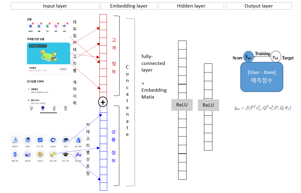 기존의 통계형 추천이나 기계 학습 알고리즘은 충분한 로그 정보를 가진 Active 고객의 추천인 경우 예측 정확도도 준수하고, 빠르고 안정적 서빙이 가능하다 보니 딥러닝까지 적용할 필요가 없었던 것이 사실입니다. 본 모델의 경우 기존의 방식으로 커버되지 못하는 비활성화 고객(1개월내 미로그인)에게 보다 유의한 추천을 제공하고자 개발이 되었습니다. 비활성 고객의 경우 가입 시 수집되는 선호정보 및 Demo 정보와 과거 계약 히스토리 정보를 활용하여 딥러닝을 적용하면 더 효과적인 추천 결과를 얻을 수 있고 기존의 타 알고리즘 추천 결과와 많이 중복되지 않는 장점을 가지고 있어 Neural CF를 적용하게 되었습니다.