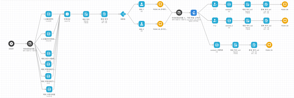 이러한 접촉정책 외에도 수많은 제외조건을 운영하고 있습니다. 가장 기본적으로는 마케팅 동의 여부를 체크하고 있고, 이 외에도 사고신고가 등록된 고객이거나 탈회한 고객 여부 등을 확인하고 있습니다. 마케터들이 선택한 필터링 조건들을 모두 통과해야만 실제로 푸시 혹은 문자가 발송될 수 있어요.