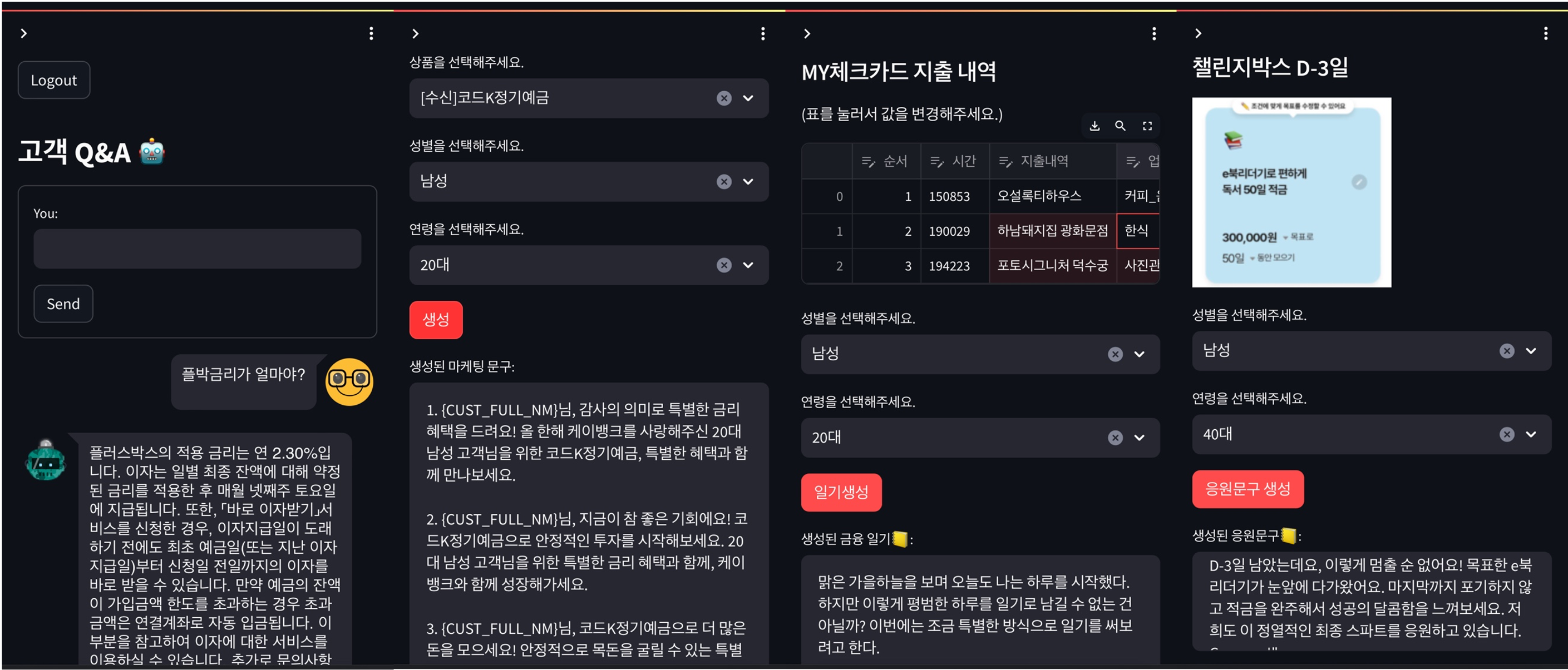 케이뱅크의 챌린지박스는 저축 목표와 기간을 정하고 해당 시점까지 목표한 금액을 모을 수 있도록 도와주는 적금 상품입니다. 만기일까지 고객의 챌린지를 달성할 수 있게 D-X별로 다른 응원문구를 생성함으로써 완주를 독려합니다.