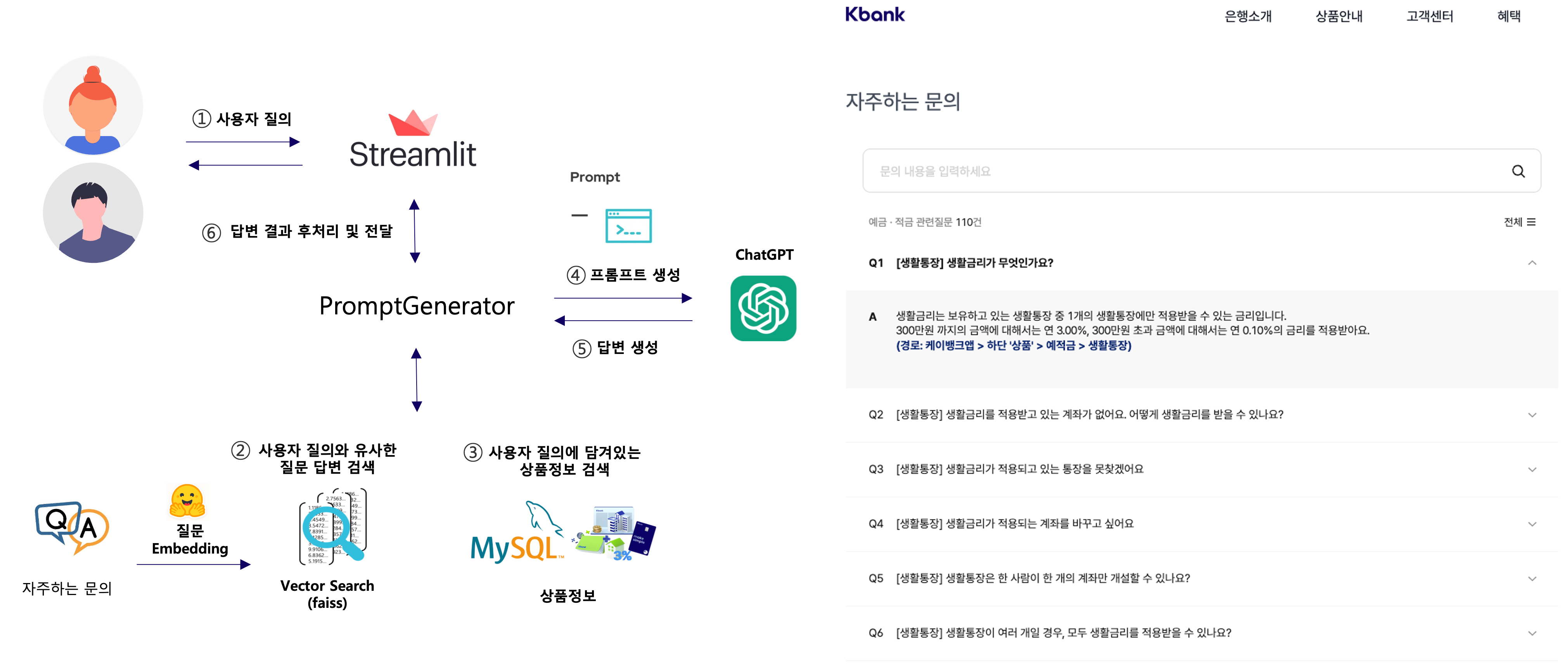 애플리케이션은 Streamlit으로 데모 페이지를 구성하였으며 OpenAI의 chat completions API를 사용해서 개발하였습니다. Q&A 챗봇의 경우에 사용자 질의와 자주 하는 문의 질문들과의 Vector Embedding과 유사도 검색을 위해 hugging face의 Sentence Transformer(jhgan/ko-sroberta-multitask) 모델과 Faiss를 사용해 아키텍처를 구성하였습니다.