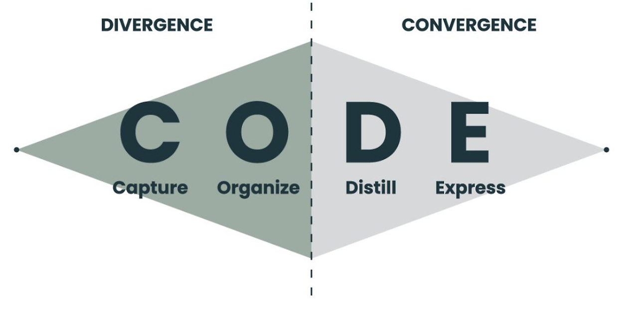 CODE 방법론은 각각의 철자로 이루어진 4단계로 이루어집니다. 간단히 C부터 O, D, E에 이르는 단계로 생산물을 만들어가라는 것입니다. 임시로 그때 생각나는 아이디어 혹은 정보들을 수집하고 차근차근 단계화하며 정리해 나가는 단계입니다.