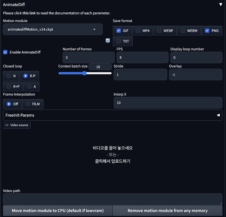 • AnimateDiff는 사용자가 입력한 프롬프트를 기반으로 애니메이션을 생성하며, 프롬프트 작성의 세부 사항에 따라 결과물의 품질과 자연스러움이 달라집니다. 특히, 구체적인 동작이나 스타일을 명확히 지정하면 더욱 정교한 애니메이션을 얻을 수 있습니다.