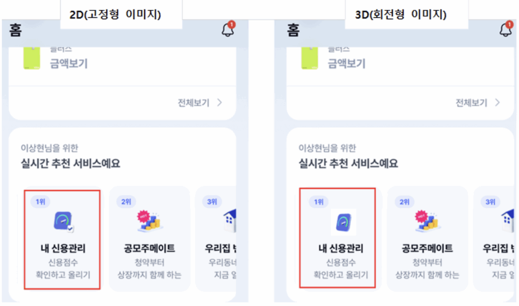조용걸님이 제작한 Turn Table 효과 애니메이션 아이콘을 홈 화면의 실시간 인기 영역 – 내 신용관리 AB 테스트에 적용한 결과입니다.