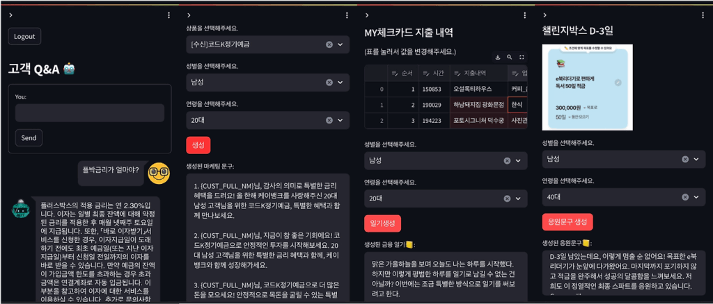 ChatGPT 등장 이후 LLM을 적용한 비즈니스 및 어플리케이션 사례들이 다양한 분야에서 소개되고 있습니다. 더 나아가서 오픈 소스 라이브러리인 LangChain과 Streamlit과 같은 패키지들은 빠르고 간편하게 LLM 어플리케이션 개발을 가능하게 하여 이러한 현상을 더 가속화하고 있습니다. 이러한 흐름 속에 금융 도메인에서도 생성형 AI의 활용은 당연한 수순의 방안일 것입니다. 행 내 그리고 DataBiz팀에서도 업무 생산성과 고객 경험 향상을 위해 관련 논의가 되고 있는 만큼 근 시일 내에 생성형 AI를 적용한 차별화된 서비스가 개발되기를 기대합니다.