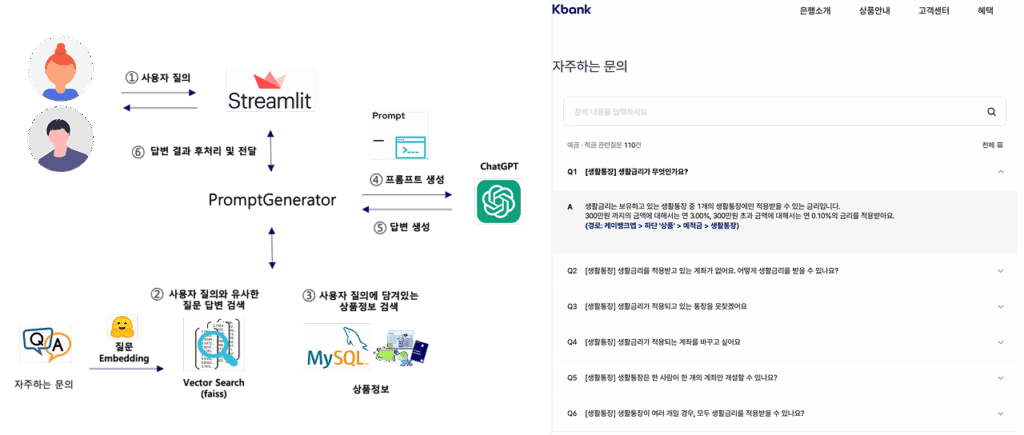 애플리케이션은 Streamlit으로 데모 페이지를 구성하였으며 OpenAI의 chat completions API를 사용해서 개발하였습니다. Q&A 챗봇의 경우에 사용자 질의와 자주 하는 문의 질문들과의 Vector Embedding과 유사도 검색을 위해  hugging face의 Sentence Transformer(jhgan/ko-sroberta-multitask) 모델과 Faiss를 사용해 아키텍처를 구성하였습니다.